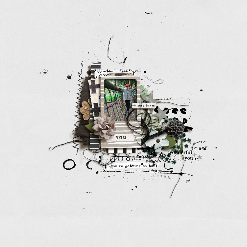 A great mix of pattern and print and a minimal colour palette coupled with lovely long trailing strips of paper to elongate the page, text stamps, arrows and paint to elongate and add texture and movement, trailing threads and a sprinkling of elements to finish.