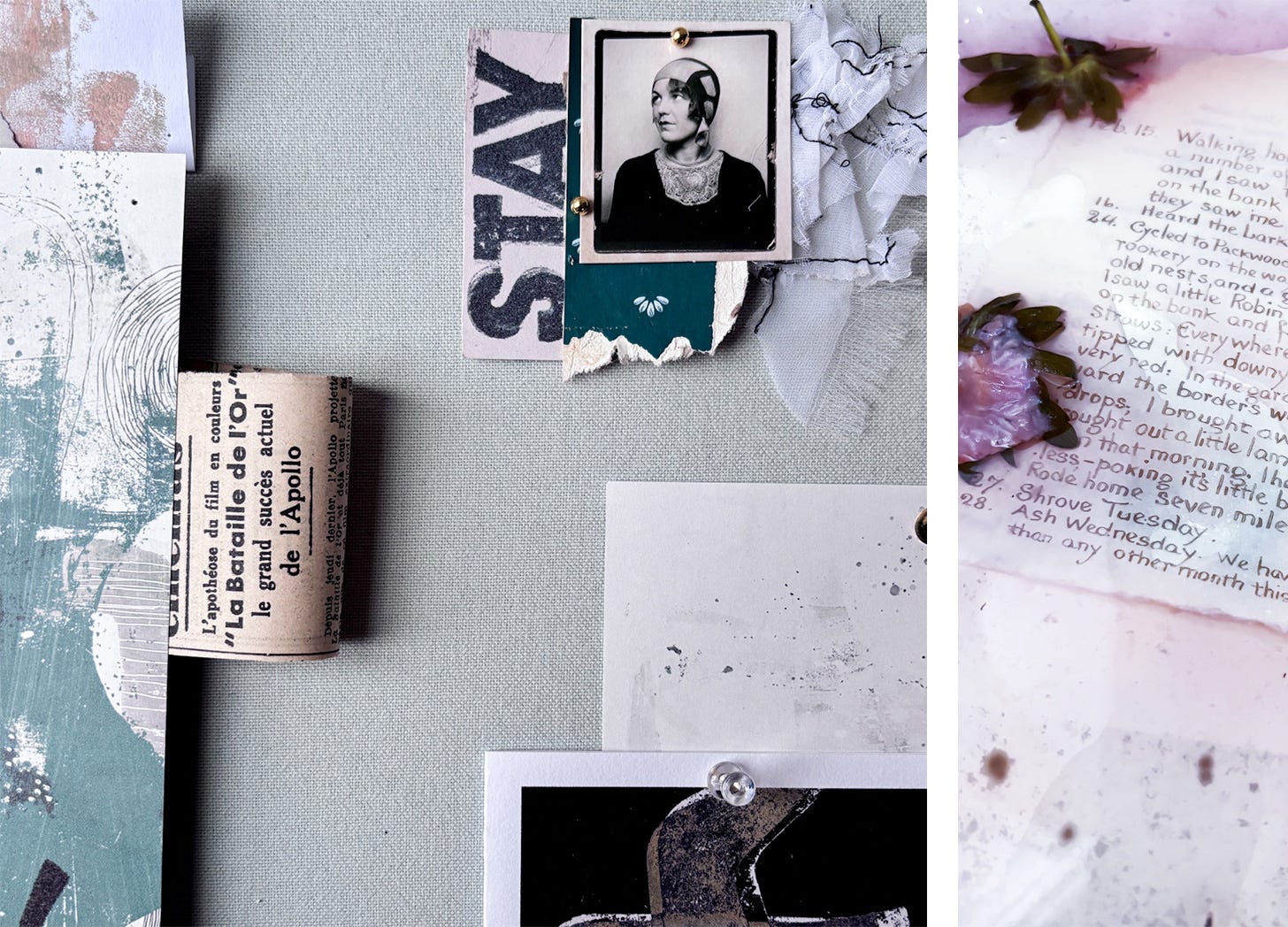 I’ve put together a bit of a ‘mood board’ on my wall using the kit, and I also had a little dabble at hand-dying some papers to combine with it. It’s been so lovely to glance up from my desk and see these pieces just staying there. Moving away from the ‘finished page’ and into creating an atmosphere in my room instead has been refreshing.