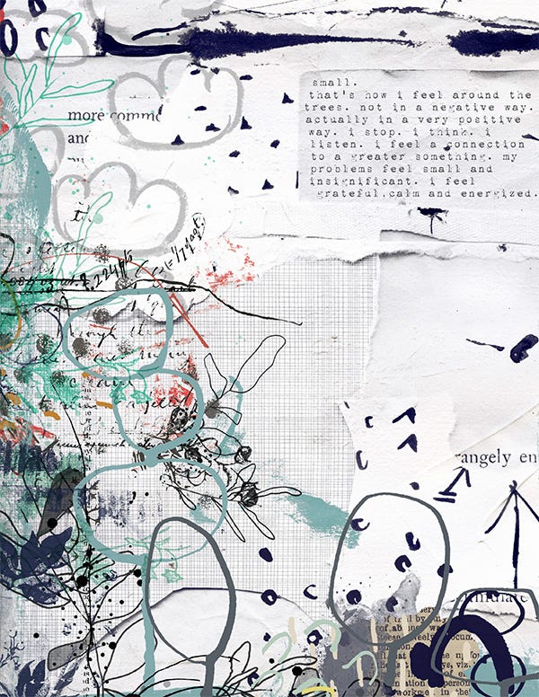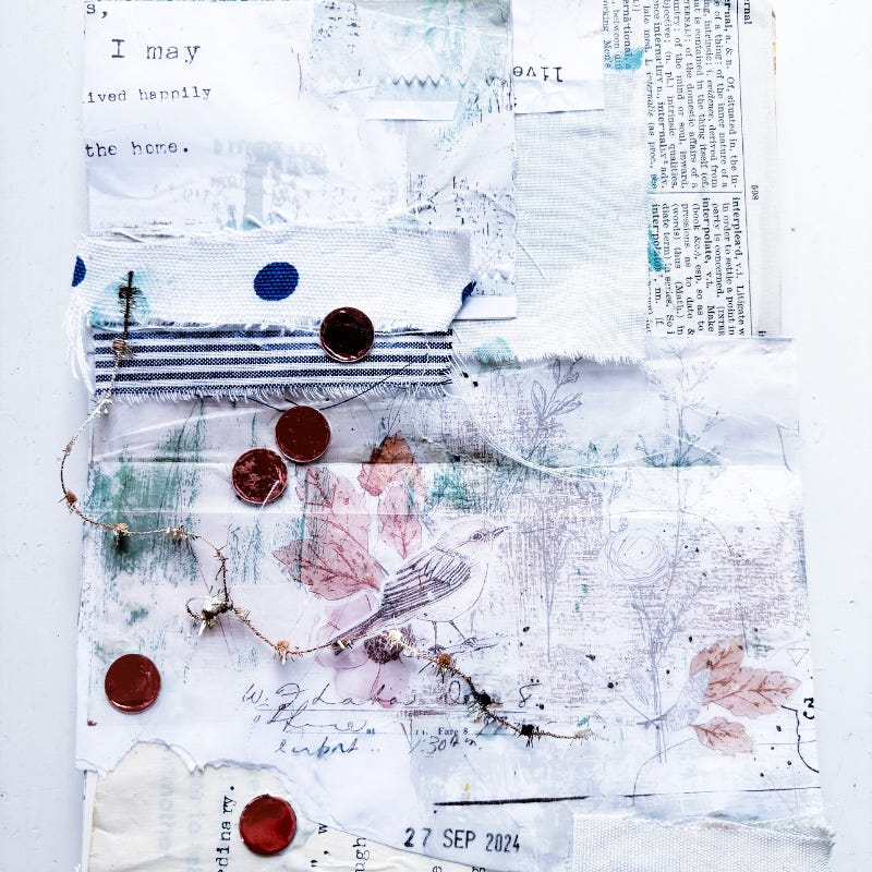 Cutting, pasting, painting, and assembling has given me a new perspective on composition and storytelling. This hands-on experience has helped me develop a habit of looking deeper into the stories I want to tell, considering how colours, textures, and symbols can enhance meaning and tell a story all by themselves.
